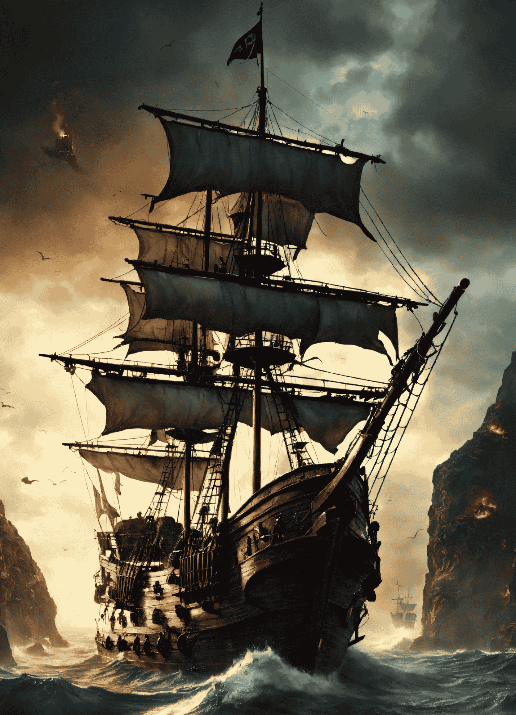 An epic fantasy scene featuring medieval pirate ship deck full with pirates.